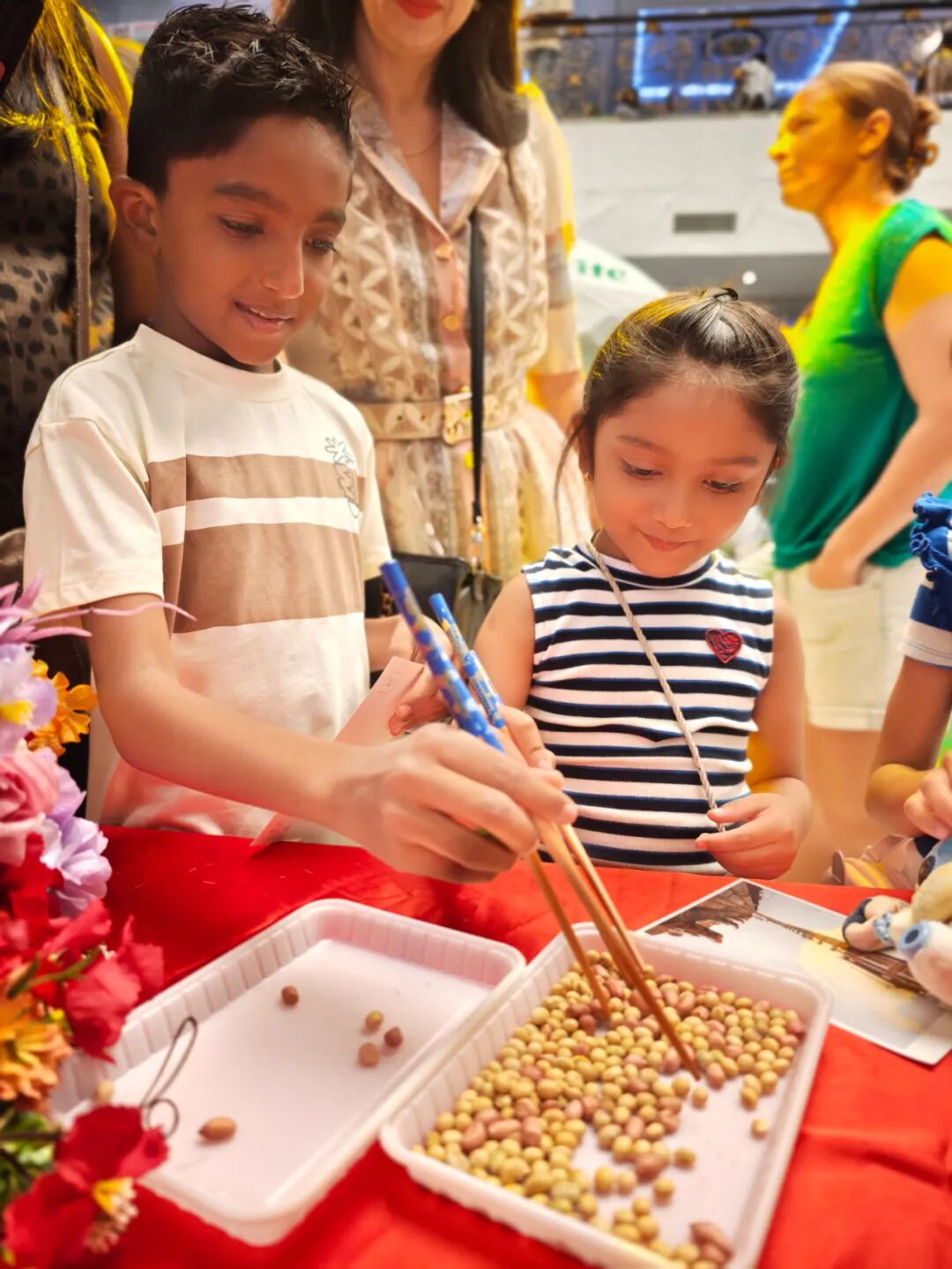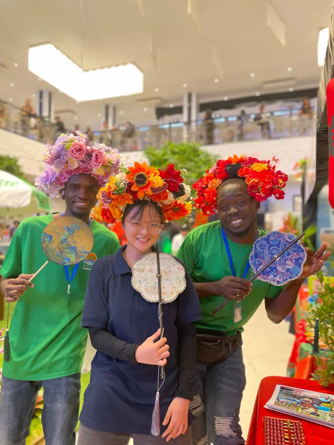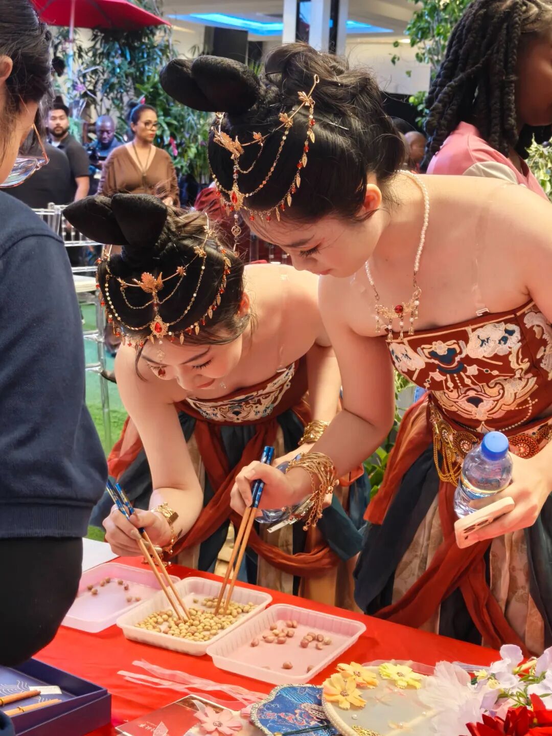 活动期间,孔院精心安排了丰富的文化体验活动。观众不仅可以体验筷子使用、了解饮食文化,还能在书法体验区用毛笔书写“福”“和”“友谊”等汉字;算盘体验区则让参与者亲手拨珠,在轻松互动中感受中国古代计算智慧。此外,观众还可以在簪花体验区试戴精美的传统簪花,感受中国古典服饰的独特韵味,并拍照留念,将美好瞬间带回家。