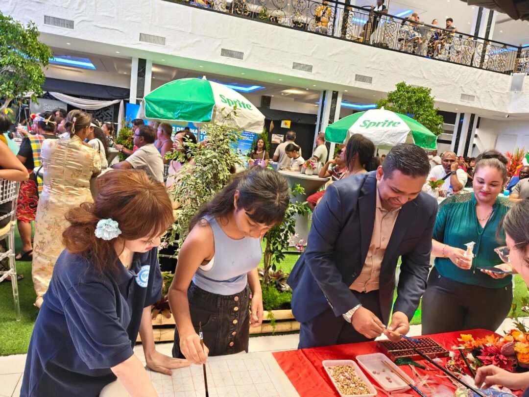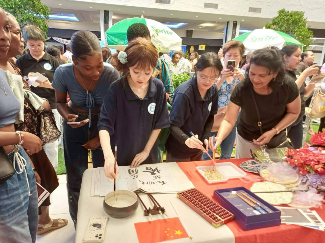 现场气氛热烈,互动不断。许多苏里南民众踊跃参与,纷纷表示对中国文化印象深刻。一位观众感慨:“中国美食不仅味道独特,更承载着家庭与团圆的文化精神;书法和算盘也让我们感受到中国文化的深厚底蕴。”