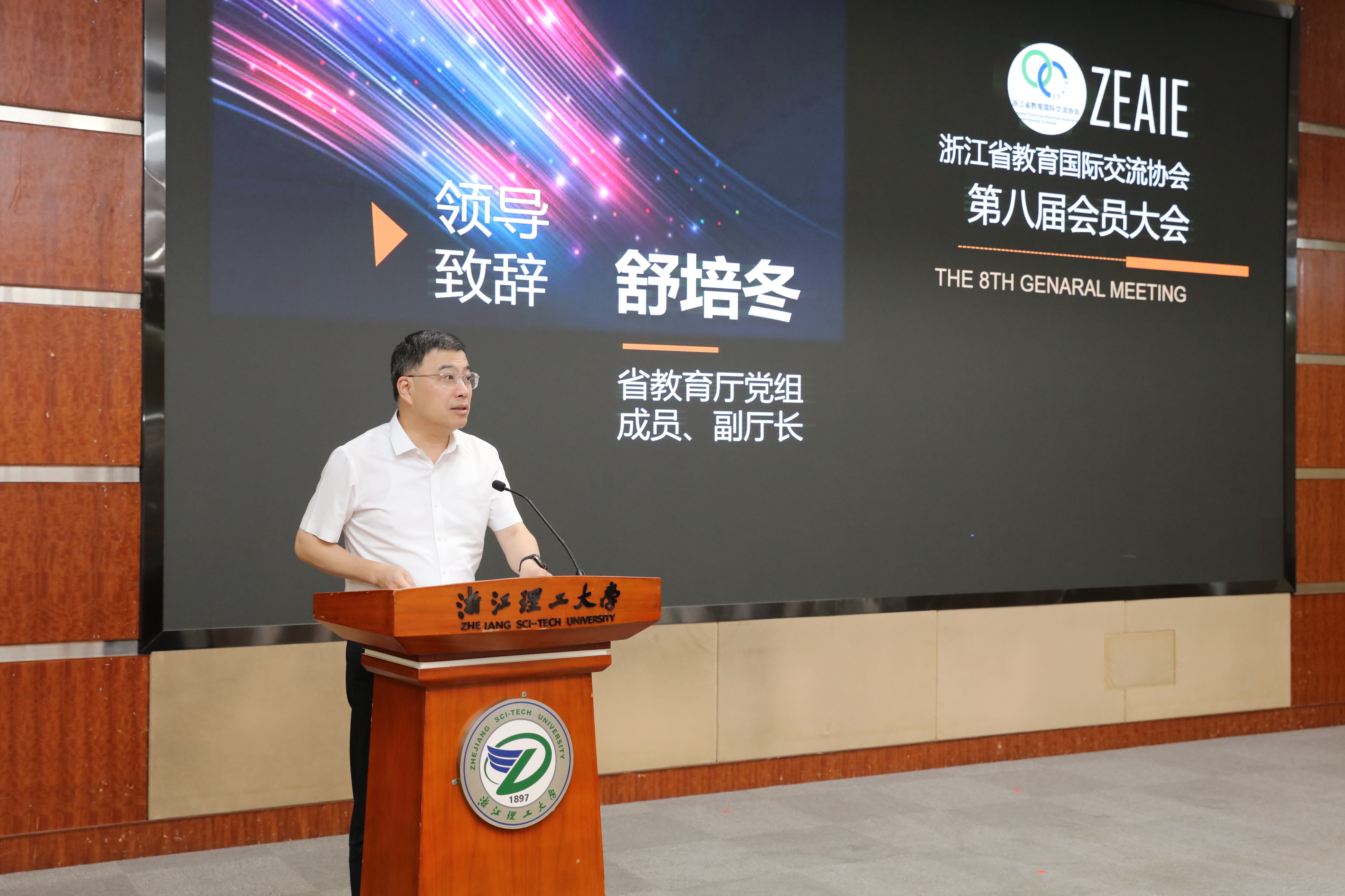 舒培冬向大会的顺利举行和协会新一届理事会表示热烈的祝贺。他表示,浙江省教育国际交流协会作为专门从事民间教育国际交流的全省性组织,一直以来主动服务政府需求,积极响应会员关切,逐步成为我省教育对外开放工作体系中不可或缺的重要力量。尤其是第七届理事会在深化中外合作办学、促进师生国际流动、加强学术科研合作、推动人文交流互鉴等方面取得了丰硕成果。他对新一届理事会提出三点要求:一是坚持胸怀天下,服务大局。要主动融入和服务新发展格局,谋划推进民间教育国际交流合作。二是坚持互学互鉴,提质增效。要统筹做好“引进来”和“走出去”两篇大文章,要在多方面下功夫,实现“量的积累”向“质的飞跃”转变。三是坚持民间特色,凝聚合力。要进一步完善工作机制,加强自身建设,不断提升协会的专业化、特色化、品牌化水平,充分发挥政府助手、院校帮手、行业推手的作用。