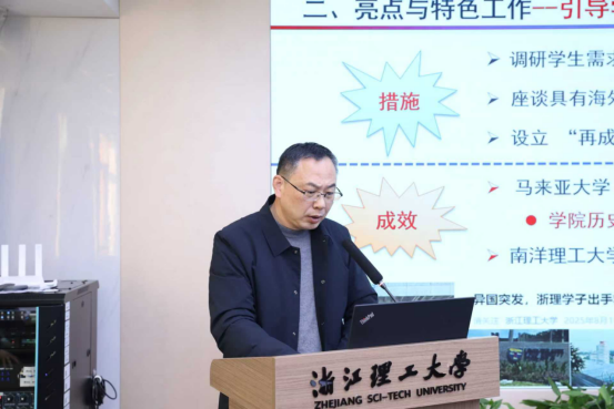 会上,国际处(港澳台办)汇报学校教育国际化重点工作及核心指标推进情况,杂志社汇报国际丝绸组织筹建工作进展,纺织学院(丝绸学院)、服装学院、信息学院(网安学院)、启新学院、马兰戈尼学院(时装学院)等5家学院做经验分享。