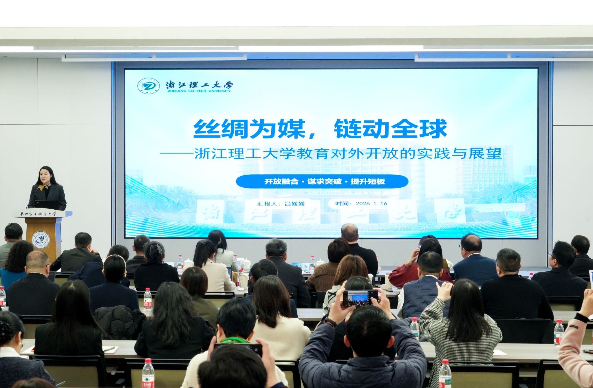 我校国际交流合作处处长、港澳台事务办公室主任吕媛媛在会上作题为《丝绸为媒,链动全球——浙江理工大学教育对外开放的实践与展望》的交流发言,系统介绍了我校以登峰学科为引领拓展国际合作的生动实践。学校打造“学科+”特色亮点,深度参与国际丝绸组织筹备,推动丝绸文化国际传播;联合筹建“一带一路”丝绸教科人协同发展联合体及联合实验室。创新“平台+”合作范式,与香港理工大学、澳门城市大学等高校共建研究中心,打造区域科教协同枢纽。构建“项目+”发展模式,持续拓展与法国、意大利等海外强校的高水平合作渠道,推动合作走深走实。